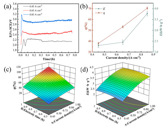 Current density and electrolysis duration are pivotal parameters influencing dissolution rates and energy expenditure in electrochemical processes. Figure 6a depicts constant current curves at a set electrolysis duration, showing an increase in potential with rising current density. This trend is due to the intensified electrochemical reactions at the electrode surface, which also boosts the dissolution rate. Figure 6b further indicates that increasing current density correlates with higher dissolution rates and energy consumption. This pattern suggests that electrochemical reactions shift from being kinetically controlled at the electrode surface to being limited by mass transport at elevated current densities, consequently raising energy demands [24,25]. The interplay between current density and electrolysis time on dissolution rates and energy consumption is highlighted in Figure 6c,d. Prolonging the electrolysis time allows for dissolution rates and energy consumption to approach levels typically seen at higher current densities, even when operating at lower current densities. This underscores the substantial impact of electrolysis time on the dissolution process, emphasizing the need to consider both current density and electrolysis time when optimizing electrochemical processes.