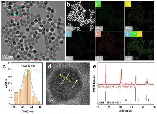 Characterization of synthesized nanoparticles: (a) HAADF-STEM image of NaYF4@NaYbF4:1%Tm@NaYF4 core–shell–shell nanoparticles; (b) scanning TEM image and element mappings of Tm, Yb, Y, and Na, with an overlap of Y, Tm, and Yb for the sample in panel a; (c) the particle size distribution of the sample in panel a; (d) high-resolution TEM image of one NaYF4@NaYbF4:1%Tm@NaYF4 core–shell–shell nanoparticle; (e) XRD image of NaYF4@NaYbF4:1%Tm@NaYF4 and the standard card (JCDSP No. 16-0334).