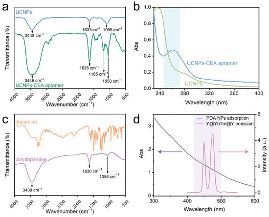 (a) FTIR spectra of NaYF4@NaYbF4:1%Tm@NaYF4 (without an organic layer, bule line), and NaYF4@NaYbF4:1%Tm@NaYF4-CEA aptamer (green line); (b) UV–vis absorption spectra of NaYF4@NaYbF4:1%Tm@NaYF4 and NaYF4@NaYbF4:1%Tm@NaYF4-CEA aptamer; (c) FTIR spectra of dopamine and PDA NPs; (d) absorption spectra of PDA NPs, and emission spectra of NaYF4@NaYbF4:1%Tm@NaYF4 UCNPs.