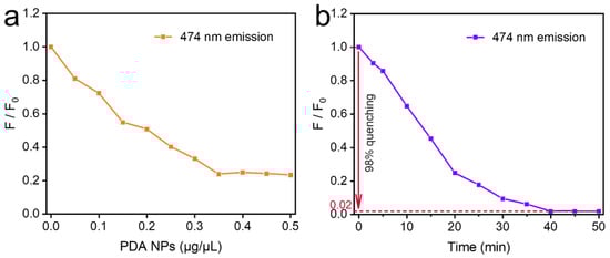 (a) Fluorescence quenching of NaYF4@NaYbF4:1%Tm@NaYF4-CEA aptamer system with different concentrations of PDA NPs (the reaction time was fixed at 20 min); (b) reaction-time-dependent fluorescence quenching of NaYF4@NaYbF4:1%Tm@NaYF4-CEA aptamer-PDA system (the concentration of PDA NPs was fixed at 0.35 μg/μL).