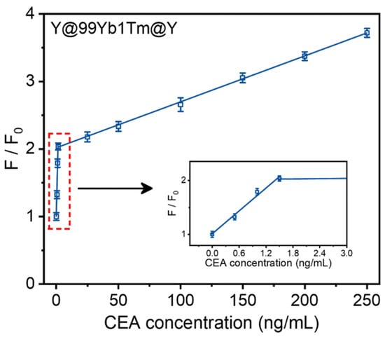 We further evaluated the detection capability of the Y@99Yb1Tm@Y-CEA aptamer-PDA NPs in complex biological matrices, and we conducted tests using 50-fold-diluted fetal bovine serum as the analytical medium. Similar to the results obtained in the HEPES buffer solution, the relationship between the upconverted relative fluorescence intensity (F/F0, where F represents the fluorescence intensity of the system at 474 nm in the presence of CEA, and F₀ is the fluorescence intensity in the absence of CEA) and CEA concentrations in diluted fetal bovine serum also showed a linear two-segment correlation. As shown in Figure 6, when the concentration of CEA was in the range of 0~1.5 ng/mL, the detection limit was 0.013 ng/mL (S/N = 3); when the concentration of CEA was in the range of 1.5~250 ng/mL, the detection limit was 1.38 ng/mL (S/N = 3). The similarity between the results above and those in the HEPES buffer suggests that our sensor maintains high sensitivity even in more complex biological matrices. The limits of detection in the diluted serum were slightly higher than those in the HEPES-buffered solutions due to the high complexity of the serum environment. As shown in Figure S5, the fluorescence images of the aptasensor correlated with the CEA concentrations, clearly showing the quenching and recovery processes at different CEA levels. In addition, a standard addition experiment was performed with four diluted serum samples. As shown in Table 2, the recovery rates ranged from 92.2% to 108.7%, and the relative standard deviation (RSD) remained below 6%. These results are acceptable for quantitative determination in biological samples.