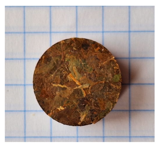 The prepared lemon balm herb fractions were then subjected to agglomeration via a hydraulic testing machine (Fritz Heckert EU 20, Karl-Marx-Stadt, Germany), utilizing the following compaction pressures: 100, 150, and 200 MPa. A closed die with a pressing chamber diameter of 15.6 mm was used. The herb samples, with a mass of 2 g, were manually introduced into the working chamber, and then compaction was carried out under pressure control. The resulting samples were found to be cylindrical in shape, with a consistent diameter (see Figure 1). Following the compaction process, the samples were subjected to a stabilization process for 48 h to ensure the stability of the internal stresses.