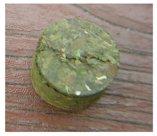 - The determination of the static strength of the obtained granules was carried out by performing radial compression (Brazilian test) 48 h after the agglomerate was produced and again after a storage period of 3 months. In this test, the cylindrical sample was subjected to compressive loading along its diameter. This type of loading causes the sample to fail when the tensile strength, in the direction perpendicular to the plane of symmetry of the granule containing the load direction, is exceeded. The tests were conducted using an Insight 2 strength testing machine (MTS, Eden Prairie, MN, USA), where the loading process was set under quasi-static conditions. The compaction process was continued until fractures originating in the central part of the sample (cylinder) were visible to the naked eye (see Figure 2).