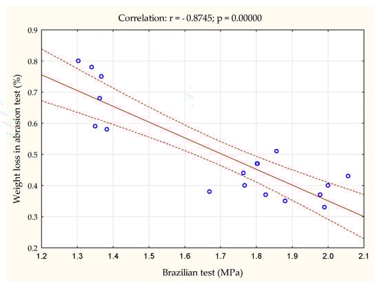 The correlation relationships between the strength tests utilized in the study and the density of the resulting product are demonstrated in Figure 4a,b. An enhancement in agglomerate density led to a reduction in agglomerate weight loss during the abrasion test. Additionally, an enhancement in agglomerate strength parameters, as measured by the Brazilian test, was observed, exhibiting a high correlation coefficient of r = 0.96 with an increase in density.
