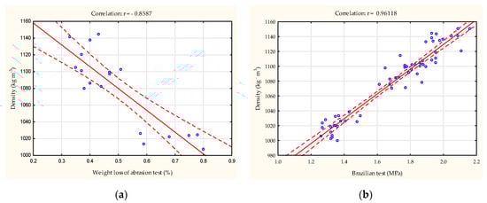 The correlation between the product density and the abrasion test (a) and the Brazilian test (b) was examined.