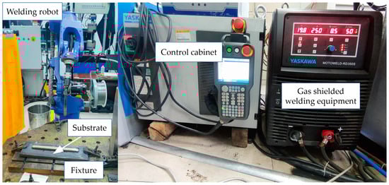 In this study, the wire was 316L stainless steel flux-cored wire with a diameter of 1.2 mm, which was produced by Jinqiao Welding Materials Group Co., Ltd. (Tianjin, China). The model of flux-cored wire is E316LTI-1 in AWS. The main chemical composition of 316L stainless steel flux-cored wire is shown in Table 1. The experimental platform mainly consisted of a Yaskawa NX100 six-axis welding robot, a fusion electrode gas shielded welding equipment, a wire feeder, and a shielding gas delivery system, as shown in Figure 1. To ensure the quality of the forming process, a ISO E235B steel plate with dimensions of 400 × 200 × 16 mm was selected as the substrate. As high internal stresses can be generated during the forming process, a fixture was used to hold the substrate in place to prevent warping and deformation. In addition, a laser pyrometer (DL333600 from Deli Tools Co., Ltd., Ningbo, China) was used to monitor the surface temperature of the workpiece to ensure proper control of the interlayer temperature.