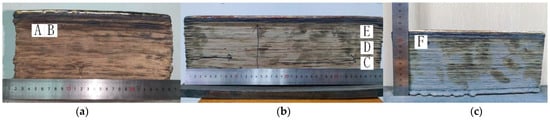 Figure 3. WAAM 316L plates. (a) V20; (b) V30; (c) V40. The letters A to F indicate the sampling positions for subsequent metallographic tests.