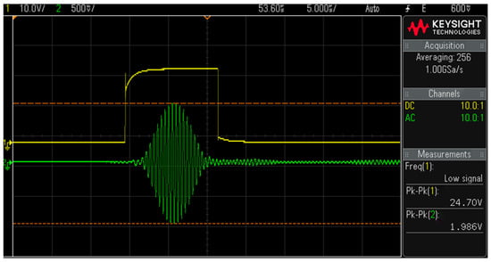 Figure 5 shows the time domain signal on the oscilloscope, where the green curve is the signal received by the receiving probe, and the yellow curve is the gate signal for Fourier integration of the received signal. The time-domain signal was then subjected to a Fast Fourier Transform or a Short Time Fourier Transform (depending on the purity of the received signal) to obtain a frequency-domain signal. Then, we obtained the maximum amplitude of the fundamental wave and second harmonic wave. Subsequently, the nonlinear parameter could be calculated using the formula β = A 2 / A 1 2 .
