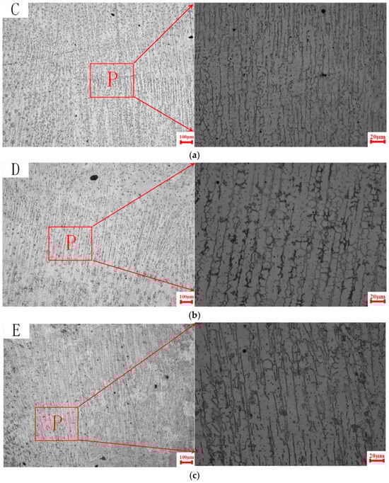 As illustrated in Figure 6, the vertical cross-sectional microstructure corresponding to positions C, D, and E in Figure 3 is presented under the V30 processing parameters. The right side of the figure shows magnified views of the P region on the left. The microstructure of the cross-section along the deposition direction is predominantly characterized by oriented columnar grains. In the lower region, the columnar dendrite spacing is approximately 7.14 µm, with a small number of secondary dendrites observed. In the middle region, the columnar dendrite spacing increases to approximately 14.81 µm, and the number of secondary dendrites rises, although their morphology is less pronounced. In the upper region, the columnar dendrite spacing increases further to approximately 17.6 µm, and secondary dendrites become clearly visible. These observations indicate that during the gradual accumulation of layers, the columnar grains near the substrate in the lower region are smaller and more compact. The dendrite spacing increases with the number of deposited layers, accompanied by a corresponding increase in the number of secondary dendrites.