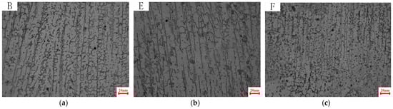 As illustrated in Figure 7, the microstructures corresponding to positions B, E, and F in Figure 3 are depicted at different scanning speeds at the same height. The columnar dendrite spacing was measured to be approximately 20.77 µm under the V20 parameters; approximately 17.6 µm under the V30 parameters; and approximately 12.04 µm under the V40 parameters. It is evident that the size of the columnar dendrite spacing is primarily influenced by the cooling rate. Increases in welding speed are associated with a rise in the temperature gradient, leading to a continuous decrease in columnar dendrite spacing.