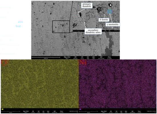 As illustrated in Figure 8, the WAAM 316L stainless steel comprises a matrix phase of austenite γ and a precipitation phase of ferrite δ. Among these elements, Cr and Mo are enriched in the ferrite, while Ni is depleted. In austenitic stainless steel, the occurrence of localized element diffusion phenomena is evident. Specifically, ferrite-forming elements, such as Cr, exhibit diffusion from austenite to ferrite, while the austenite-forming elements, including Ni, demonstrate the opposite behavior. This phenomenon is attributed to the short-range diffusion mechanism. EDS spectroscopy was performed on the matrix and precipitation phases of the V20 specimen to analyze the composition and proportion of each element in the matrix and precipitation phases. The specific compositions are shown in Table 3.