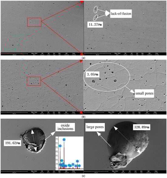Figure 9. Typical morphological characteristics of internal defects. (a) Lack-of-fusion; (b) micro-pore, V30; (c) oxide inclusion.