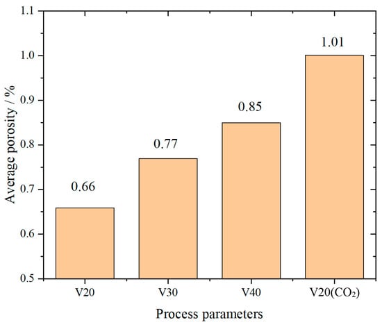 Porosity, defined as the ratio of pore volume to total volume, is a critical parameter reflecting the density of a material. It is the primary forming defect in arc additive manufacturing materials, and excessive porosity can lead to the deterioration of various mechanical properties, such as strength, toughness, and hardness, thereby compromising the reliability and safety of the manufactured components. Therefore, controlling porosity is essential for achieving high-quality forming in arc additive manufacturing. In this study, the planar porosity was determined by calculating the ratio of the defect area to the total area in microscopic images. Using the binary images of micro-defects derived from Figure 10, the porosity in the forming direction was calculated as the ratio of pixels with a grayscale value of 255 (black regions) to the total number of pixels in the image. Indeed, there is strong distribution on pores by the process. However, upon removing the surface of the plate, it can be observed that the porosity distribution at other locations is relatively uniform. Therefore, we refer to the standard ISO 4967: 2013 [21]. Porosity parameters were analyzed and averaged in 20 random fields of view from multiple specimens to minimize the randomness and dispersion of the calculated results. The porosity values of the specimens formed under different process parameters are presented in Figure 11.