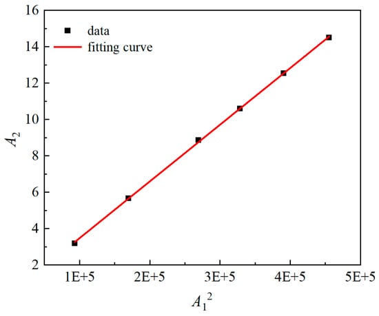 Based on the data in Table 3, the relationship curve between A 1 2 and A2 was plotted. The slope of the curve represents the ultrasonic nonlinear parameter β. As shown in Figure 14, a strong linear relationship is observed between A 1 2 and A2. Furthermore, the ultrasonic nonlinear parameter demonstrates minimal fluctuation under varying output energy levels, thereby indicating that the testing system exhibits excellent stability.