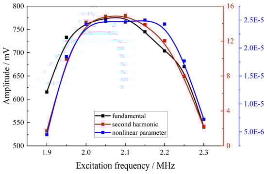 Nonlinear ultrasonic testing was performed on the V20 specimen under different excitation frequencies, while maintaining constant conditions otherwise. The effect of varying excitation frequencies on the ultrasonic nonlinear parameter was analyzed, with the excitation frequency ranging from 1.9 MHz to 2.3 MHz at intervals of 0.05 MHz. The experimental results are presented in Figure 15. As demonstrated in the figure, the second harmonic amplitude is significantly smaller compared to the fundamental amplitude. The fundamental amplitude, second harmonic amplitude, and relative nonlinear parameter exhibited an initial increase and subsequent decrease with increasing excitation frequency, reaching a peak at an excitation frequency of 2.1 MHz. This frequency was selected to achieve a more prominent second harmonic signal and a higher relative ultrasonic nonlinear parameter.