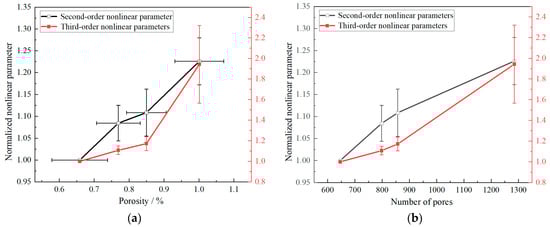 Figure 19. Relationship between defects characterization and normalized nonlinear parameter. (a) Porosity; (b) number of pores.