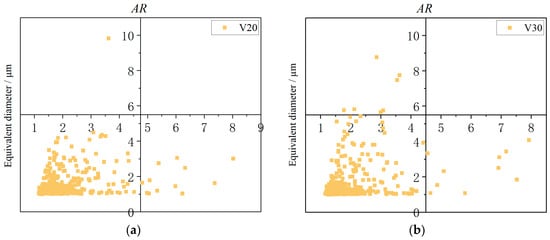 In order to further characterize the morphological features of the defects, the aspect ratio (AR) of the defects observed in the SEM micrographs was subjected to analysis. ’Equivalent diameter’ refers to the maximum diameter of each pore, and ‘AR’ refers to the ratio of maximum and minimum inner diameters of the pores, given that the majority of the pores are elliptical, with a close proximity to the circle. These data were obtained from the ImageJ software. As shown in Figure 13, the AR values of the defects at different scanning speeds are predominantly concentrated between 1 and 2, indicating a relatively high degree of circularity. However, some defects exhibit AR values greater than 2, thereby displaying a flattened pore morphology. It is evident that the extent of flattening of the defect is directly proportional to the magnitude of the AR value.