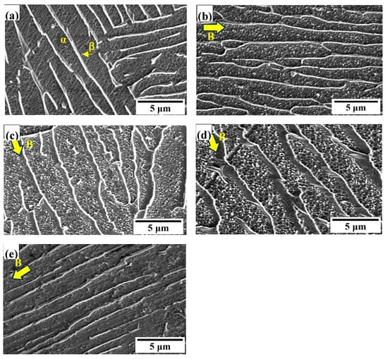 Figure 3 shows the SEM microstructure (8000×) of PDCT alloys with different DCT times. As shown in Figure 3a, the untreated ZTC4 alloy mainly consisted of a long-stripe α phase with a black color and a needle-like β phase with a white color. No noticeable precipitates were observed in the α phase, and the orientation of the β phase was chaotic.