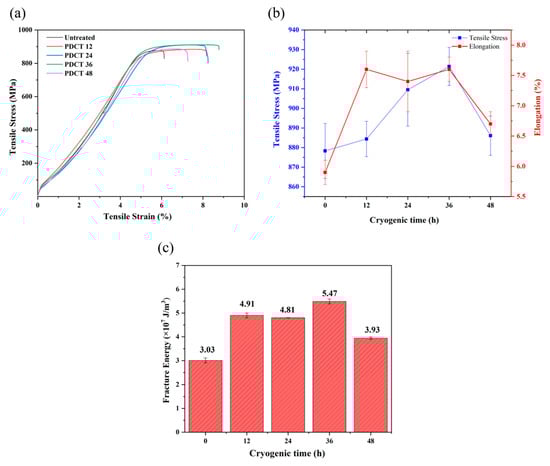 Mechanical properties of PDCT alloy with different cryogenic times. (a) Stress–strain curve; (b) tensile strength and elongation; and (c) fracture energy.