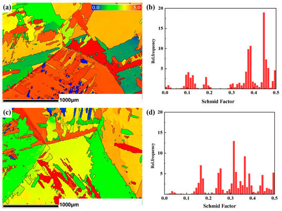 The Schmid factor was introduced to investigate the strength characteristic. Figure 5 shows the change and distribution statistics of the Schmid factor before and after PDCT. Figure 5a,c show the distributions of Schmid factors before and after PDCT. The whole Schmid factor of the untreated sample was generally large, with values above 0.3 in most areas. In contrast, the Schmid factor decreased significantly after PDCT processing. According to the statistical results in Figure 5b,d, the Schmid factor of the untreated sample was 0.3465, mainly distributed in the range of 0.35–0.5. The average Schmid factor of PDCT36 was 0.3141 and mainly distributed in the range of 0.3–0.4.