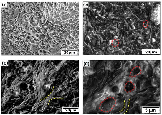 Figure 6 shows the tensile fracture of the PDCT sample under SEM. Compared with the untreated sample in Figure 6a, the PDCT sample had noticeable dimples, which are represented by red dashed lines in Figure 6b,d. Figure 6c,d show the rheological characteristics (yellow dashed lines) in the PDCT samples. The fracture surface of PDCT enhanced the toughness and rheological properties of the alloy and supported the performance characteristics in terms of strength and toughness.