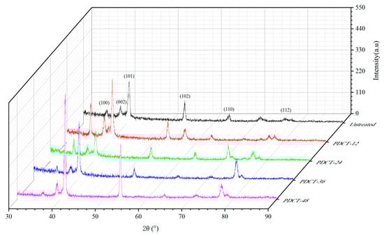 The grain orientations of the PDCT alloys significantly changed apparently. The three strongest peaks of the untreated sample corresponded to the (002), (101), and (102) diffraction peaks, among which (101) was the main peak. The three strongest diffraction peaks of PDCT12 and PDCT24 were (100), (101) and (102), respectively. For the PDCT36 and PDCT48 samples, the three strongest diffraction peaks were transferred to the (101), (102) and (112) crystal planes, and the overall intensity significantly decreased.