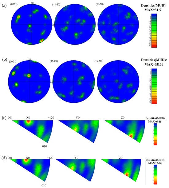 In the pole figures (Figure 8a), the highest strength of the untreated sample was 31.90. After the sample was subjected to PDCT (Figure 8b), the highest strength was 35.94. The plate texture orientation was insignificant. In the inverse pole figure, the PDCT-ed ZTC4 titanium alloy shifted towards (010) in the X0 direction, and the highest strength of the untreated sample’s inverse pole figure was 6.41 (Figure 8c), while after the sample was subjected to PDCT, the highest strength was 7.72 (Figure 8d). The more significant the maximum value of pole density strength, the more pronounced the preferred crystal orientations. The (001) and (−120) directions of some grains in the untreated sample were parallel to the X0 direction of the sample coordinate system, and after PDCT, they shifted towards the (001) and (010) directions. The preferred orientations appeared in these two directions.