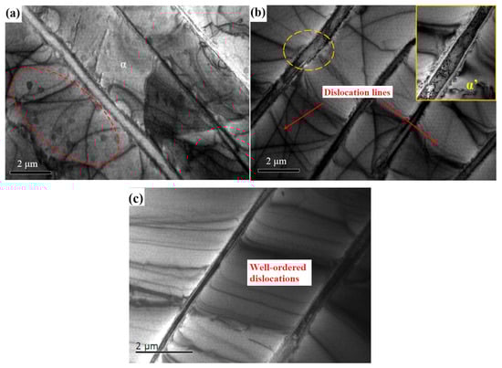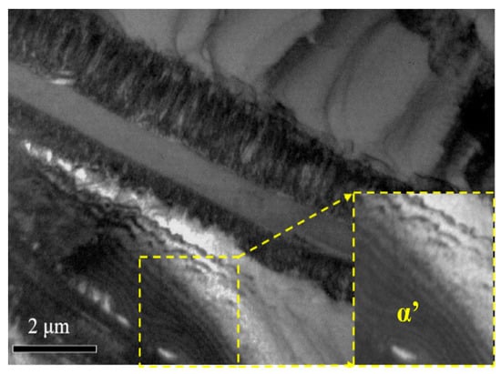 As shown in Figure 13, some secondary phases appeared along the phase interface between α and β in the PDCT sample. The α’secondary phase appeared at the β edge, demonstrating the transition from β to α. Therefore, the α lath was thickened after PDCT, which was also considered to be the result of the incomplete phase transition promoted by PDCT. The secondary α′ phase was short and rod-like at the micro and nanoscale (as shown by the yellow lines in Figure 9b). As shown in Figure 9a, there were a few second precipitates in the untreated sample.
