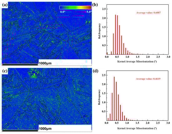 Figure 10 reveals the KAM diagram and distribution histogram before and after PDCT. Figure 10a,c show the KAM distribution maps, where the blue regions represent areas with low local orientation differences and the green regions represent areas with high local orientation differences. Zhang reported that the accumulation of geometrically necessary dislocations at grain boundaries was due to the uneven micro-strain [31].