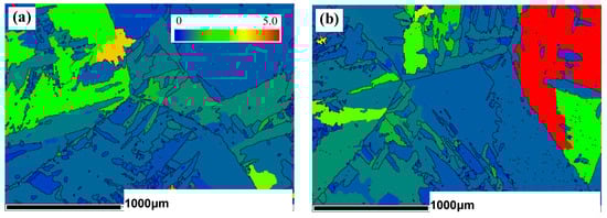 The grain orientation spread (GOS) of the cross-section of untreated and PDCT samples was studied, as shown in Figure 11. The GOS diagram is regarded as a measurement of dislocation density and strain in a single grain. Its average value is a quantitative estimate of the orientation deviation within the grain, mainly reflecting some grains with large deformation. The color bar is displayed in the upper right location of Figure 11a. The region with a small GOS indicates a more uniform strain distribution, while a large GOS represents a higher dislocation density, which may be caused by dislocation plugging. The red part in the upper right corner of Figure 11b shows the region with the highest GOS value compared with other grains, which is close to 5.0. This value shows that the average orientation difference in this grain is large, indicating a higher dislocation density and higher strain.