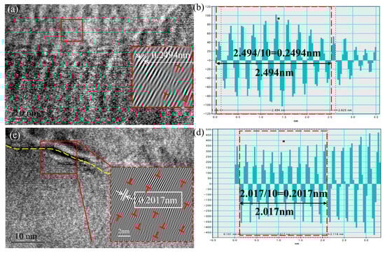 IFFT images of high-resolution and lattice spacing of untreated and PDCT samples; (a) high-resolution image of untreated sample; (b) lattice spacing of untreated sample; (c) high-resolution image of PDCT36 sample; (d) lattice spacing of PDCT36 sample.