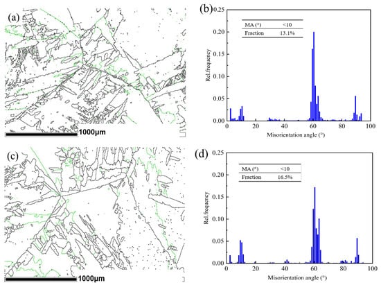 Because the secondary α′ phase mainly appeared at the grain boundary, the types and orientations of the grain boundaries of the untreated and PDCT samples were investigated, as shown in Figure 14. The black lines represent high-angle grain boundaries (HAGBs), while the green lines represent low-angle grain boundaries (LAGBs) whose misorientation angle (MA) is less than 10°. The black HAGBs were the main component in the two typical samples. In the untreated sample, the green LAGBs were initially preferentially distributed at the grain boundaries (Figure 14a).