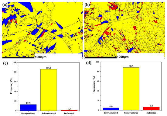 We initially focus on the grain type in typical TC4 titanium alloys (Figure 15). As shown in Figure 15a,b, the blue, yellow, and red regions represent recrystallized grains, sub-grains, and deformed grains, respectively. Figure 15c,d show the proportion of different grains. After PDCT treatment for 36 h, the recrystallized grains of the samples were reduced from 12.5% to 4.9% and transformed into sub-grains (increasing from 85.8% to 88.5%) or deformed crystals (increasing from 1.3% to 6.6%). The percentage of sub-grains and deformed grains increased by 2.7% and 5.3% in PDCT36 compared with the untreated sample. This phenomenon indicates that PDCT treatment promotes the nucleation and growth of sub-grain structures, mainly through aggregation at grain boundaries or phase boundaries, transforming into small-sized sub-grains driven by high-density dislocation.