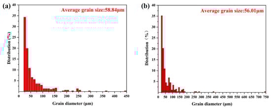 We now focus on the distribution of grain size before and after PDCT (Figure 16). After the sample was subjected to PDCT, the average grain size decreased from 58.84 μm to 56.01 μm. The general trend of grain size reduction shifted from the columnar distribution to the left, and the number of grains larger than 100 μm in diameter significantly decreased. When the grain size was smaller, the grain boundary area became larger. Nucleation at grain boundaries was more likely to occur during solid-phase transformation because of the high energy of the grain boundaries and the significant activity of atoms. The increase in the number of grain boundaries with the refinement of grains enhanced the nucleation rate, facilitating the generation of the precipitated phase to a certain extent. The overall grain size refinement means the simultaneous improvement of strength and toughness at the macro level.