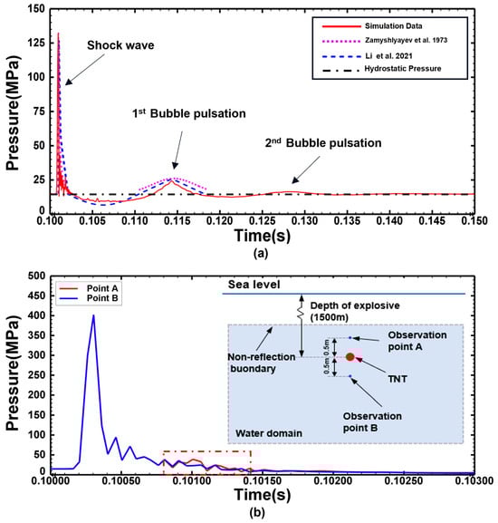 To verify the effectiveness of the simulation method, an explosion at a water depth of 1500 m without a shell model is simulated, and the explosion shock wave and hydrostatic pressure are first verified. The pressure time–history curve, extracted at a horizontal distance of 150 cm from the explosion center, is shown in Figure 2a. The hydrostatic pressure in the water domain is fairly stable before the explosive detonation and reaches the hydrostatic pressure of the determined water depth as expected. After the explosive is detonated, the peak pressure of the explosion shock wave and the peak pressure of secondary loading appear successively at the observation point. The simulated peak pressure of the explosion shock wave and bubble pulsation are in good agreement with the theoretical values. Eventually, the pressure at the observation point stabilizes at hydrostatic pressure in the later stages of the simulation.