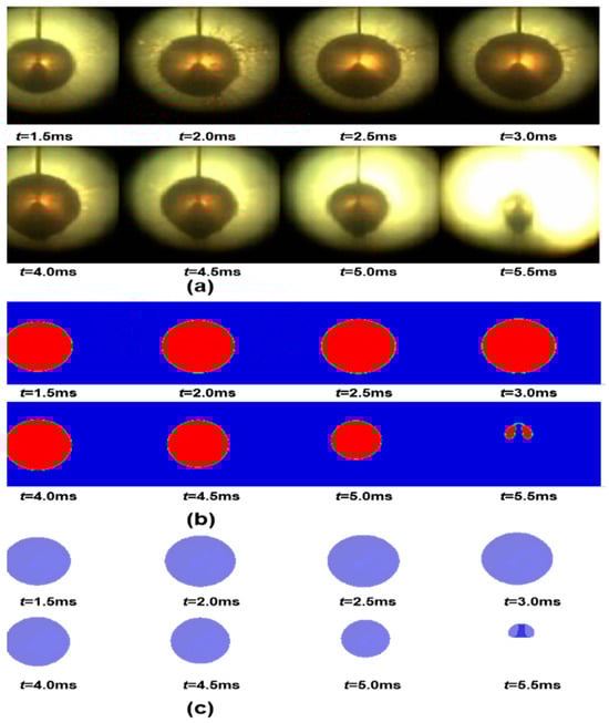 Comparison of bubble calculation results to experimental results [23]. (a) Experimental observation diagram of bubble pulsation process; (b) Profile view of simulation result; (c) Schematic diagram of bubble pulsation process.