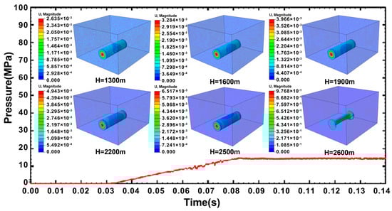 By applying uniform pressure, the ultimate load-bearing capacity of the shell can be found, and the following simulated water depth interval is determined. Before the explosive is detonated, the surface wall and both ends of the shell are subjected to the hydrostatic pressure of the predetermined water depth. When the water depth is less than 2500 m, there is no obvious deformation on the surface of the cylindrical shell. The hydrostatic pressure on the surface of the cylindrical shell progressively rises as the depth of the water increases. The shell structure can no longer withstand the pressure when the water depth exceeds 2600 m, and the hydrostatic pressure induces the buckling collapse of the cylindrical shell. An identical cylindrical shell is also used for linear buckling load prediction using the keyword *Buckle. The obtained critical pressure matches the 2600 m water depth. Figure 4 shows the displacement response of the cylindrical shell to hydrostatic pressure when the explosion distance is 225 cm. The result demonstrates that stable loading of hydrostatic pressure could be achieved, and the cylindrical shell does not exhibit any unexpected motion, satisfying the requirement of the subsequent simulations.