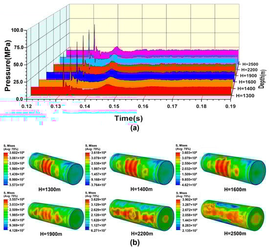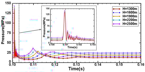 When the explosion distance is 225 cm, the explosion loading response of the cylindrical shell can be studied by changing the water depth. Figure 7a shows the pressure time–history curves of the points at a horizontal distance of 150 cm from the explosion center at different water depths. After the explosion of TNT, the shock wave propagates rapidly. The pressure of the explosion shock wave reaches its peak in a very short time and fluctuates greatly in the attenuation stage. With the increase in water depth, the attenuation effect on the shock wave leads to a slight decrease in the shock wave overpressure. However, under the coupling action of the hydrostatic pressure, the total pressure remains relatively stable. The increase in the explosion depth influences the bubble pulsation period, and the time interval of the secondary loading decreases gradually. At the same time, the increase in the explosion depth leads to an increase in the peak value of the secondary loading pressure, which greatly improves the damage efficiency of underwater explosions. Figure 7b shows the stress-strain state of the shell after explosion shock wave loading at different water depths, and it can be seen that the shell does not undergo large deformation. At this moment, the bubble is still in the stage of expansion.