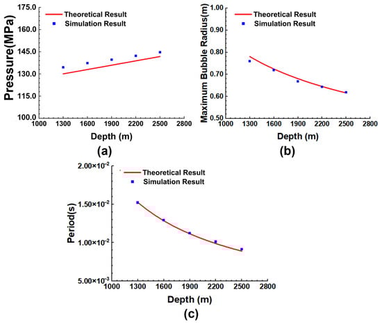 Comparison between theoretical and simulated values of explosion parameters under different explosion depths: (a) peak pressure of the shock wave; (b) maximum bubble radius; (c) bubble pulsation period.