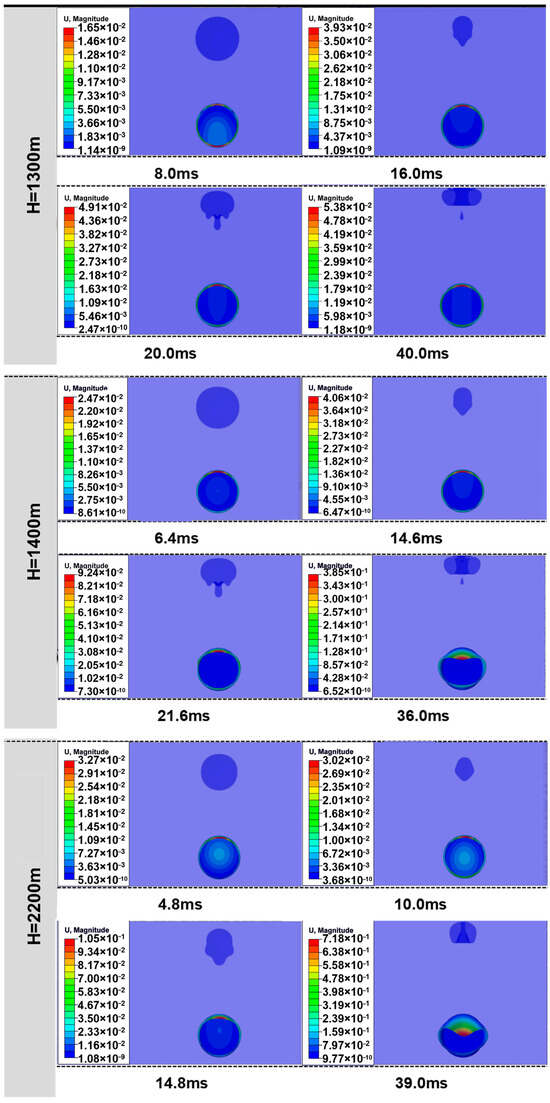 The dynamic response process of a cylindrical shell under bubble pulsation loading at different water depths is shown in Figure 7c. At a depth of 1300 m, the shell has no buckling deformation under the combined action of shock wave loading and bubble pulsation loading. The bubble undergoes the pulsating process of expansion, shrinkage, and re-expansion, and finally forms an annular bubble. Due to the influence of Bjerknes forces, the contraction process of the lower part of the bubble is affected, resulting in the whole bubble forming a spindle shape. With increasing water depth, the deformation of the shell increases gradually. When the water depth reaches 1400 m, buckling deformation occurs under the secondary loading, and a large deformation occurs at the top of the shell. After the detonation of the TNT, the explosion shock wave propagates outwards rapidly, and a part of the shock wave is diffracted to the back of the cylindrical shell. The action time of the shock wave on the shell surface is quite short, so it quickly passes through, despite the high peak value. As a result, the center of the blast face of the shell does not appear to be largely deformed. Secondary damage of the cylindrical shell occurs under the combined action of hydrostatic pressure and bubble pulsation loading. The action time is much longer compared to the shock wave, which results in the large deformation of the top and middle portions of the cylindrical shell.