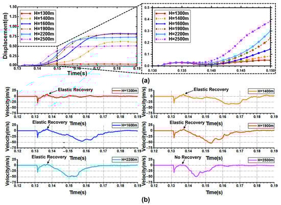 In the bubble shrinkage stage, the bubble is strongly attracted by the structural plane, so the shell will restore a certain elastic deformation, as shown in Figure 8a. This figure shows the displacement curves of the center points of the blast face of the shell when at an explosion distance of 225 cm, under variable water depth conditions. The center point on the blast face of the shell can be accelerated to tens of meters per second after the action of the shock wave when the water depth is 1300 m. However, there is no large deformation because of the short action time. In the process of bubble shrinkage, the elastic deformation of the center point of the blast face of the shell is restored. The water jet formed by bubble expansion hinders further recovery of elastic strain, and then the shell is affected by bubble pulsation loading. In the process of the second bubble pulsation, the deformation of the shell fluctuates continuously and tends to be stable under bubble pulsation loading. Finally, there is no collapse of the shell, and the deformation velocity of the center point of the blast face of the shell approaches 0 m/s.