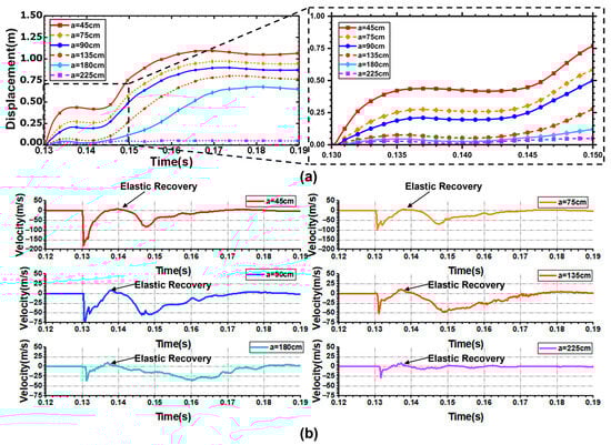 (a) Displacement time-history curves at the center points of blast face and back face of the shell; (b) Time-history curves of velocity change at the center point of the blast face of the shell.