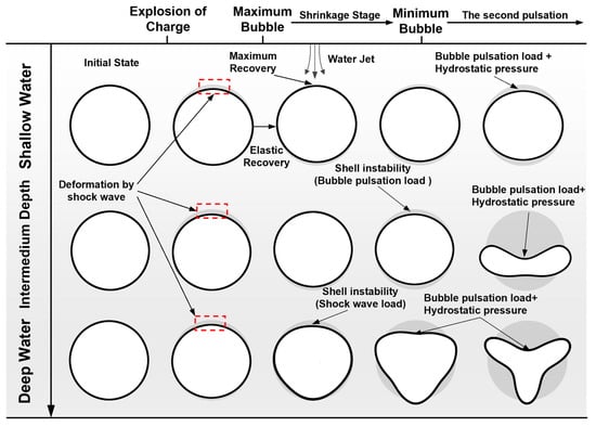 The failure mechanism of the cylindrical shells subjected to underwater explosions at different explosion depths can be summarized as illustrated in Figure 11. In shallow water, the shell is successively subjected to an explosion shock wave load and a bubble pulsation load. The shell is deformed after the shock wave, and then part of the elastic strain is restored by the bubble contraction. Finally, the shell continues to deform under the action of the water jet and bubble load. However, at this moment, the shell does not reach the threshold of instability, and the shell vibrates due to the bubble pulsation process, and finally approaches a stable state.