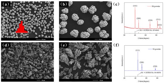(a,b) SEM images and (c) XRD pattern of the original Pd powder. (d,e) SEM images and (f) XRD pattern of the original Ni powder.