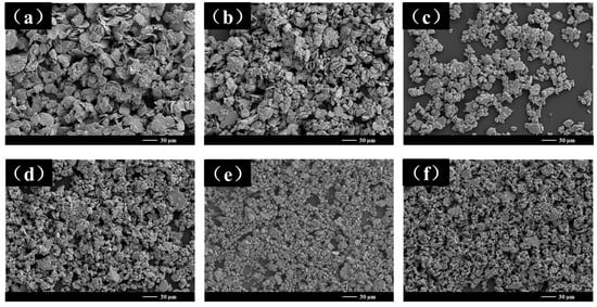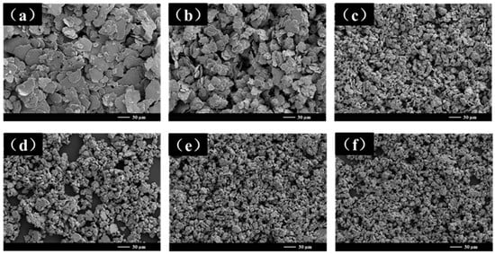 SEM images of NiPd samples of BPR20 with different ball milling times: (a) 10 h; (b) 20 h; (c) 30 h; (d) 40 h; (e) 50 h; (f) 60 h.