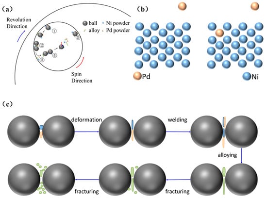 (a) Schematic diagram of the movement of the vials, powders, and grinding balls. (b) Schematic diagram of atomic migration. (c) Schematic diagram of particle morphology changes. The gray balls, blue balls, and orange balls represent grinding balls, Ni atoms, and Pd atoms, respectively. The blue particles, orange particles, and green particles in (c) represent Ni powder, Pd powder, and alloyed powder, respectively.