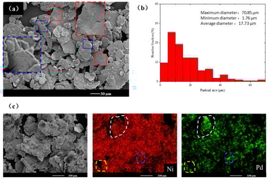 Experimental results of the NiPd-10 sample. (a) SEM image. Different color boxes represent different morphologies of particles, and the corresponding boxes with dashed lines are the magnified images of the spots denoted by the same color. (b) Particle size distribution histogram. (c) Element distribution map, where the irregular dotted boxes of different colors are the regions of the corresponding sample particles.