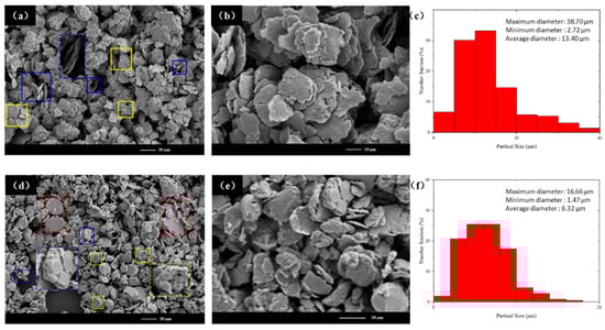(a) Low-magnification SEM image and (b) high-magnification SEM image of NiPd-20. (c) Statistical graph of NiPd-20 particle size. (d) Low-magnification SEM image and (e) high-magnification SEM image of NiPd-30. (f) Statistical graph of NiPd-30 particle size. The blue box represents the typical radial welding morphology of the particles. The yellow box represents the typical shear friction morphology of the particles, and the red box represents the typical welding morphology of the particles. The dashed boxes with the same color as the respective solid boxes represent their correspondent magnified images.