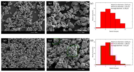 As the ball milling process continues, the particle refinement process enters a new stage. The particle size of the alloy particles continues to decrease. Figure 7 shows the SEM images of the samples at this stage (NiPd-40 and NiPd-50). Figure 7a,b are low-magnification and high-magnification SEM images of NiPd-40, respectively. The particle distribution of the sample at this time is relatively uniform, and the particles that were axially superimposed in the previous stage have become smooth and compact. Figure 7c presents the particle size distribution of NiPd-40, with a particle size range from 1.61 μm to 15.67 μm and an average particle size of 6.38 μm. Figure 7d,e are low-magnification and high-magnification SEM images of NiPd-50, respectively. While the particle size is decreasing, the phenomenon of agglomeration is quite significant, as indicated by the green dashed box in the figure. The clusters are generally spherical, with disordered and randomly oriented particle stacking. Figure 7f shows the particle size distribution of NiPd-50, with a particle size ranging from 1.80 μm to 13.83 μm and an average size of 5.01 μm. Compared to the squeezing stage, the reduction in particle size in this stage is limited (about 21%). The particle size distribution at this stage is more uniform and concentrated in a certain range, with the particle size difference reduced from 15.19 μm to 12.03 μm.