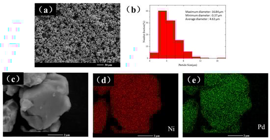 (a) Low-magnification SEM image of the NiPd-60 sample. (b) Particle size distribution histogram. (c) High-magnification SEM image. EDS mapping images of (d) Ni element and (e) Pd element.